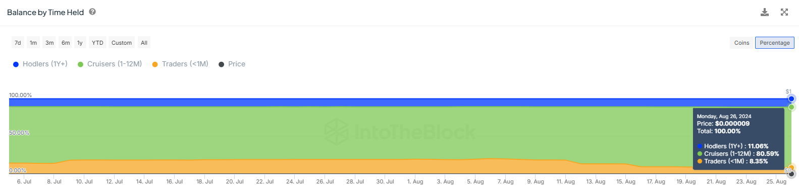 PEPE’nin kısa vadeli sahipleri, coin’i bir aydan az süreyle tutanlar olarak tanımlanır. Söz konusu bu holder’ların hakimiyetleri sadece yüzde 8’e düştü. Ancak bu, kayıtlardaki en düşük seviye olarak, PEPE’ye olan duyarlılıkta önemli bir değişikliği işaret ediyor.