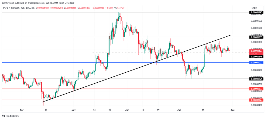 0,00001173 dolardan işlem gören PEPE fiyatı, meme coin için büyük bir nimet olan 0,00001146 dolarlık desteğin üzerinde. Ancak, 0,00001369 doları aşamaması, kârı uzak tutuyor.