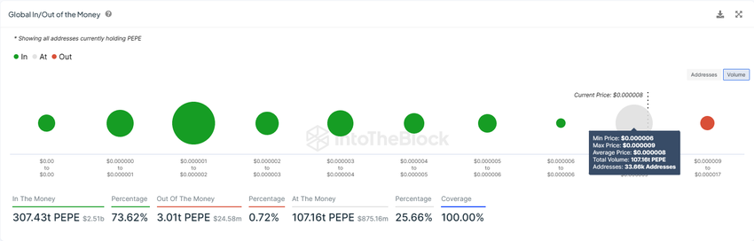 0,00000835$’dan işlem gören dünyanın en büyük üçüncü meme coin’i yatırımcılarına muazzam kârlar getirmeye çok yakın. Yaklaşık 110 milyon dolar değerindeki yaklaşık 900 trilyon PEPE, yatırımcıları için kâr elde etmenin eşiğinde. Bunun nedeni, bu arzın tüm zamanların en yüksek fiyatının% 20’si civarında satın alınmış olmasıdır.