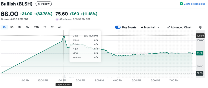 Şirket, halka arz öncesinde 1,11 milyar Dolar topladı ve 30 milyon hisseyi beklenen aralığın üzerinde, 37 Dolar’dan fiyatlandırdı. Bullish’in hissesi, gün içi en yüksek 109,9 Dolar’a ulaştıktan sonra 75,3 Dolar’dan kapandı ve şirketin piyasa değeri yaklaşık 9,94 milyar Dolar olarak değerlendi.