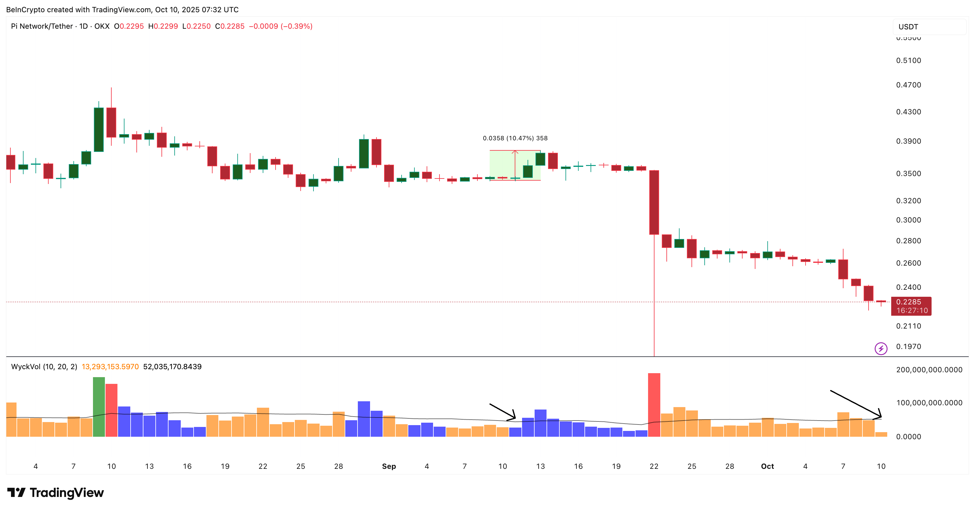 Şu anda, PI’nin grafiği sarı çubukların küçüldüğünü gösteriyor, bu da satıcı gücünün azaldığı anlamına geliyor. Bu desenin en son Eylül başında ortaya çıktığı zaman, kısa süre sonra mavi çubuklar belirdi — ve PI yaklaşık %10 yükseldi.