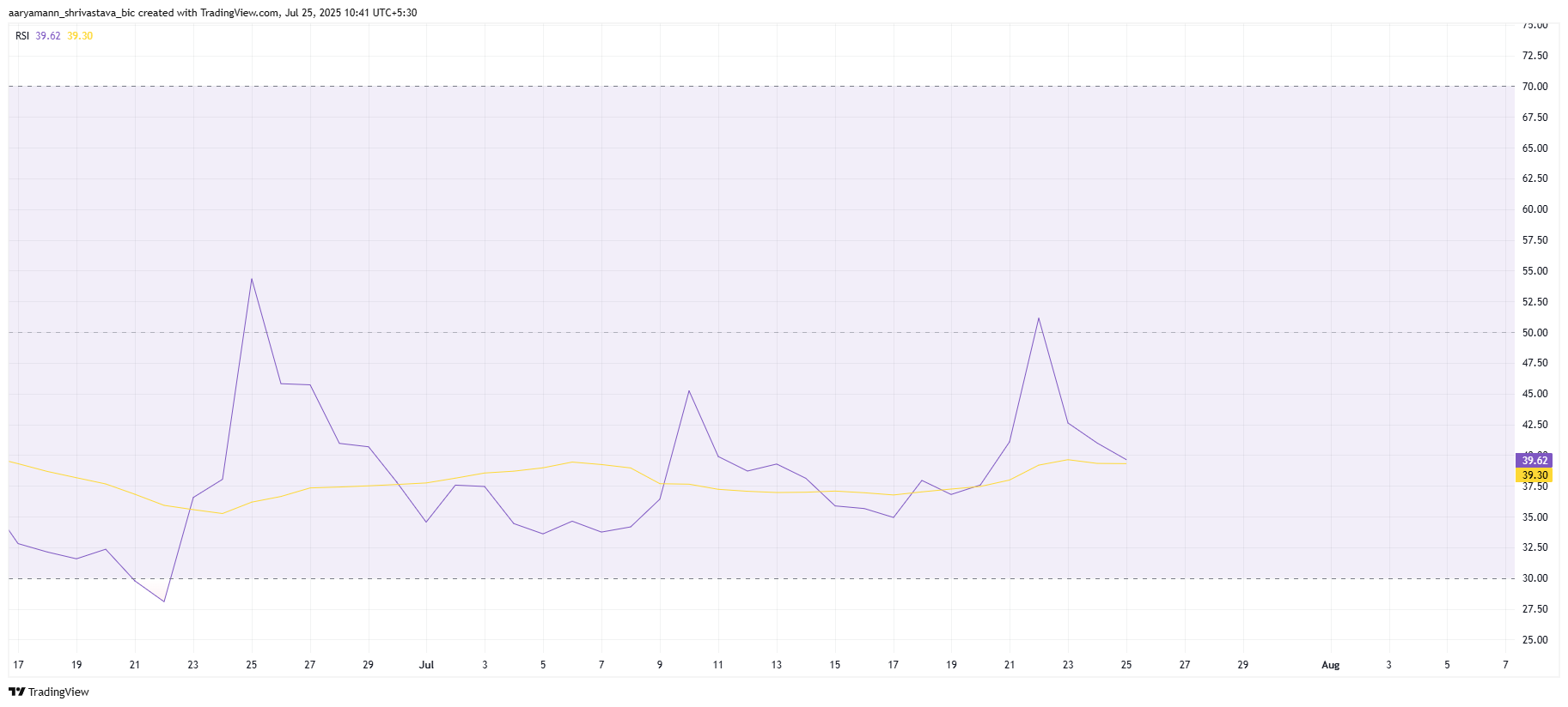 Pi Coin’in teknik göstergeleri, özellikle Göreceli Güç Endeksi (RSI), devam eden zorlukları işaret ediyor. RSI, bu hafta başında yükseliş bölgesine geçmeye çalıştıktan sonra, nötr 50,0 seviyesinin altına düşerek tekrar düşüş bölgesine girdi.