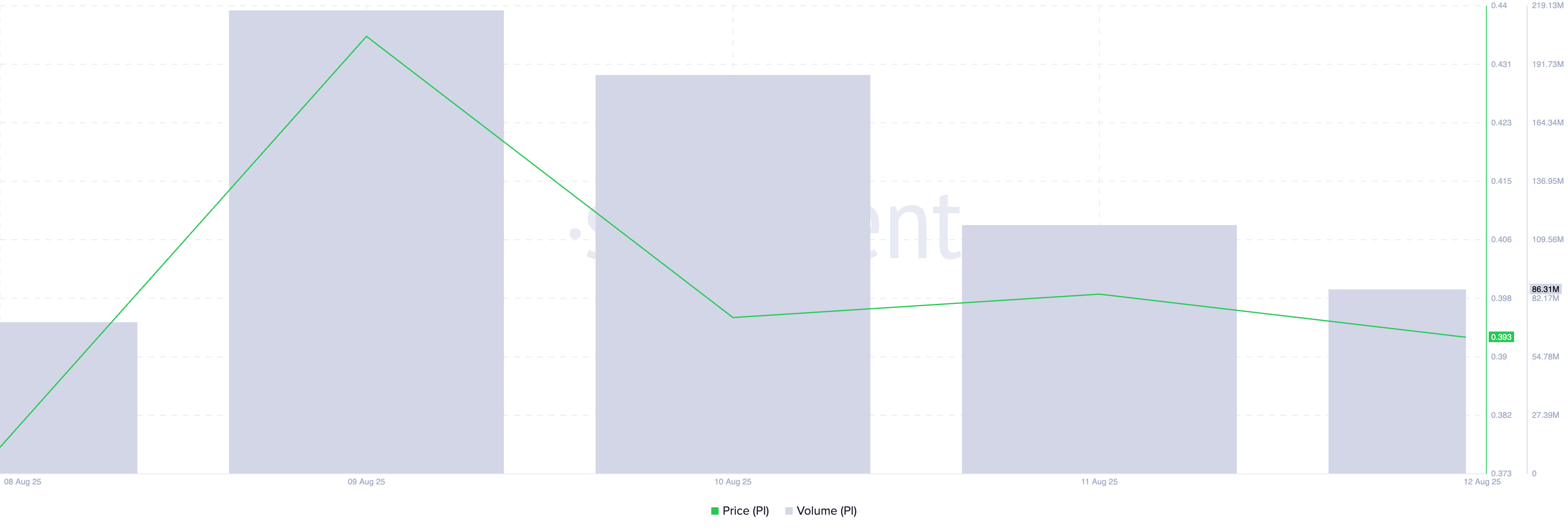 PI/USD bir günlük grafiğinden alınan veriler, PI’nin geçen hafta 0,40 Dolar bariyerini aşmak için iki başarısız girişimde bulunduğunu gösteriyor.