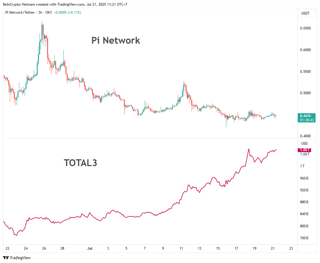 Yazı yazıldığı sırada, Pi 0,44 Dolar civarında istikrarlı bir şekilde işlem görüyor, geçen ayın zirvesinden %30’dan fazla düşüşte. Buna karşılık, altcoin piyasa değeri (TOTAL3) aynı dönemde %30 artarak 800 milyar Dolardan 1 trilyon Doların üzerine çıktı.