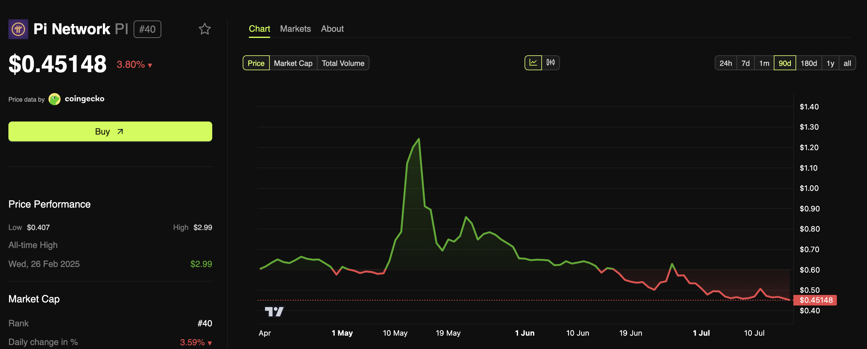BeInCrypto verileri, Pi Coin’in fiyatının iki aydır sürekli düştüğünü gösterdi.
