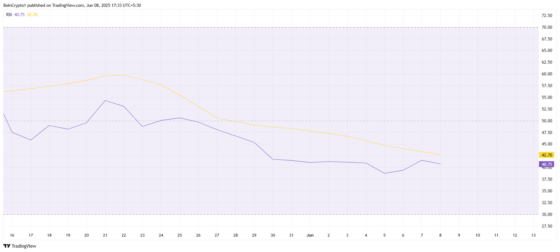 Göreceli Güç Endeksi (RSI) Pi Network için mayıs ayının sonundan bu yana nötr seviyenin altında, düşüş bölgesinde sıkışmış durumda. RSI bu bölgede daha da derinlere düşmeye devam ediyor, bu da negatif ivmenin güçlendiğini gösteriyor.