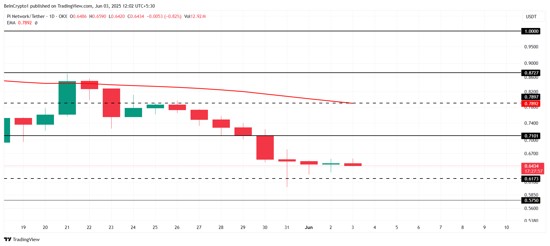 Şu anda, Pi Network’ün fiyatı 0,64 Dolar seviyesinde bulunuyor ve 0,61 Dolar kritik destek seviyesinin üzerinde tutunuyor. Ancak 50 günlük Üstel Hareketli Ortalama (EMA) bir direnç seviyesi olarak hareket ediyor ve fiyata daha fazla baskı ekliyor. Piyasa duyarlılığı düşüş eğiliminde olmaya devam ettikçe, Pi Network mevcut konumunu korumakta zorlanabilir.