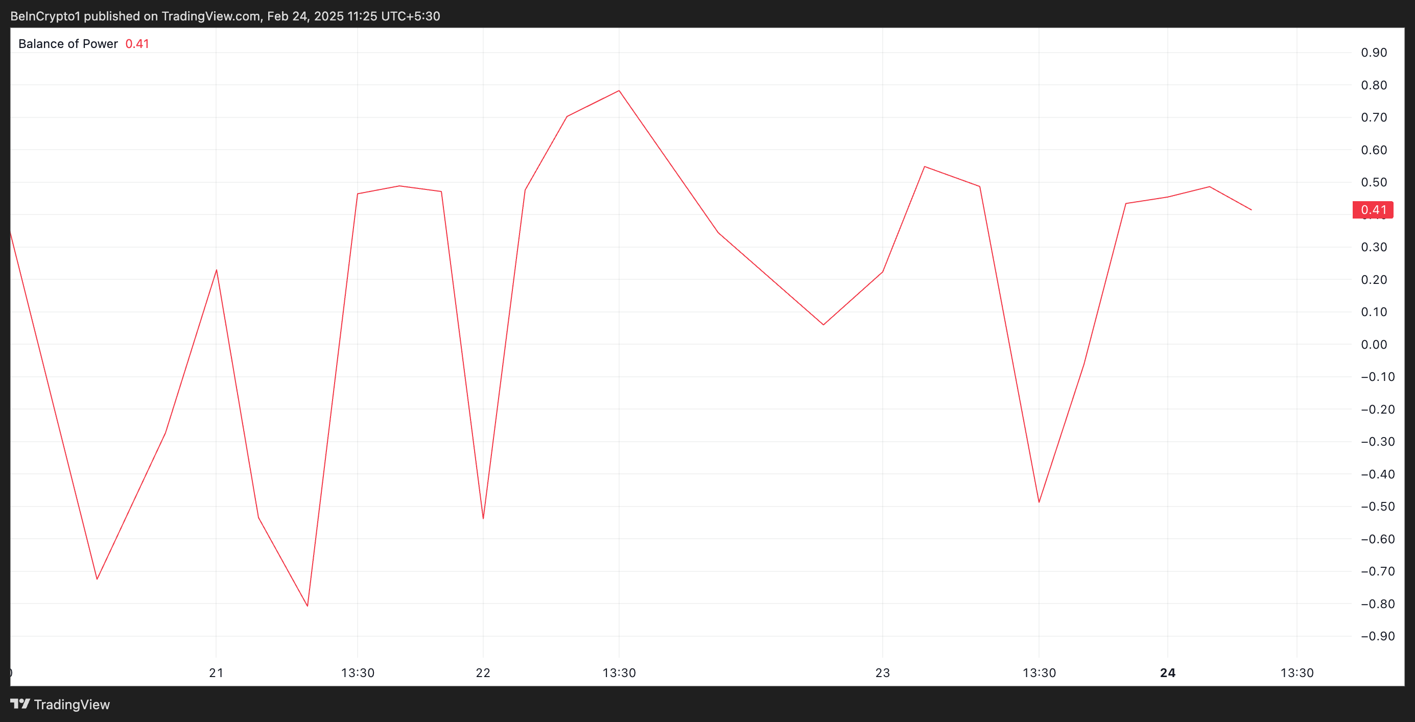 Ayrıca, PI’nin Güç Dengesi (BoP) okumaları bu yükseliş görünümünü destekliyor. Bu yazı itibarıyla, 0,41 pozitif bir değer döndürüyor.