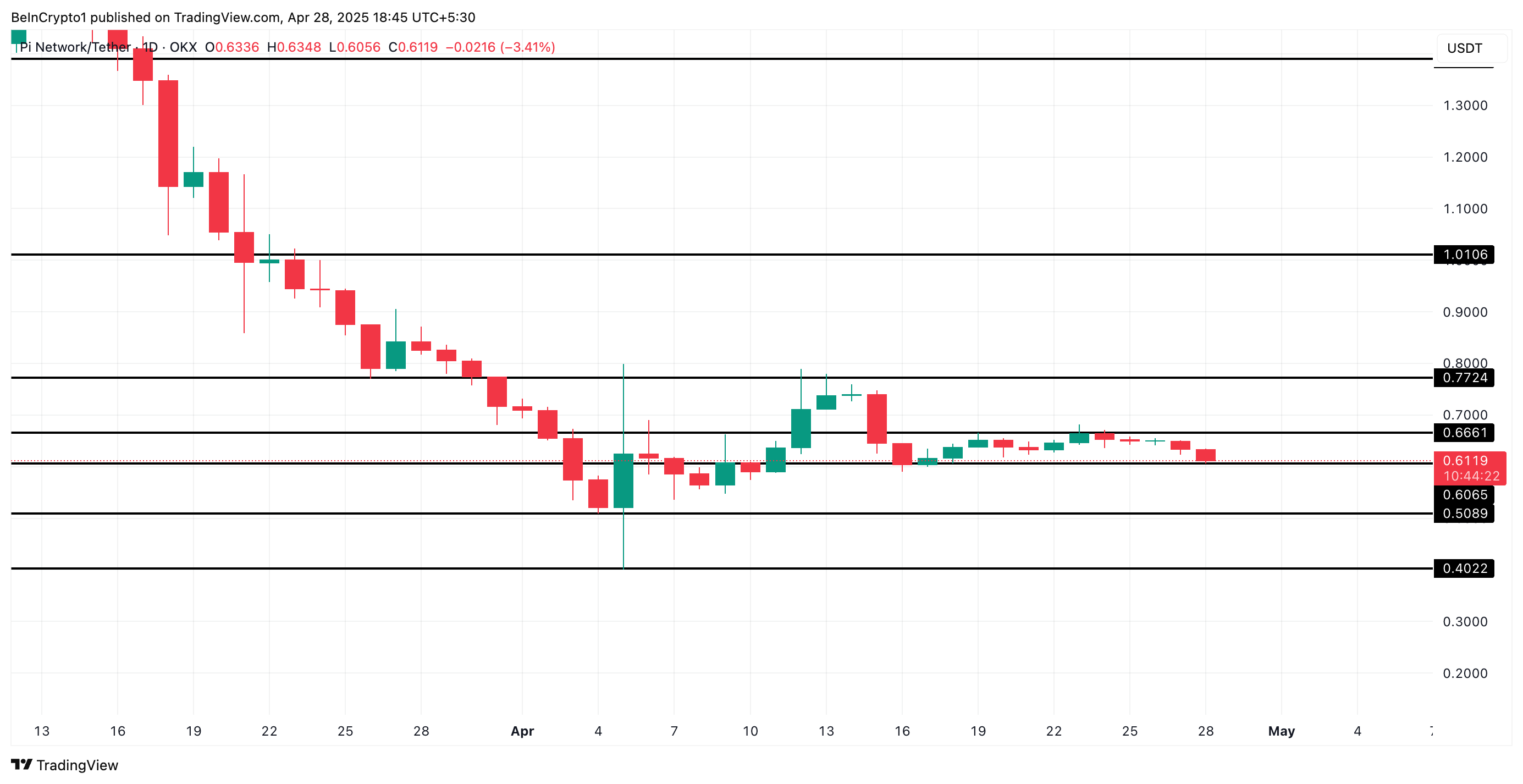 Pi Network’un PI token’ı, fiyat hareketinin durulmasıyla birlikte bir fiyat durgunluğu aşamasına girmiş gibi görünüyor. 16 Nisan’dan bu yana, token 0,66 Dolar seviyesinde dirençle karşılaşıyor. 0,60 Dolar seviyesinde destek buluyor ve dar bir trading aralığı oluşturuyor.