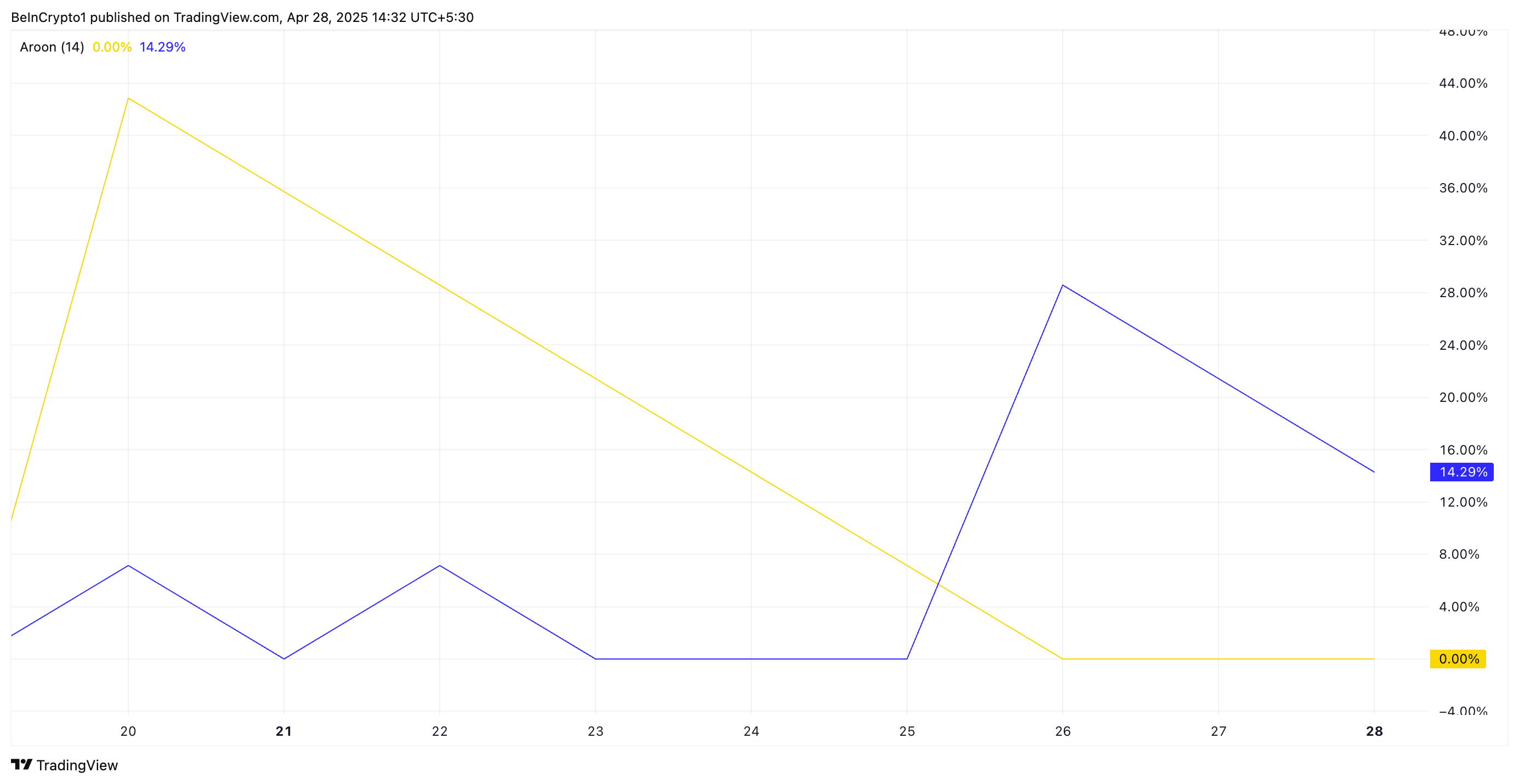 PI’nin Aroon göstergesinden alınan okumalar, fiyatındaki son durgunluğu doğruluyor. Bu yazı itibarıyla, token’un Aroon Up Line (sarı) %0 seviyesinde, Aroon Down Line (mavi) ise düşüşte ve %14,29 seviyesinde.
