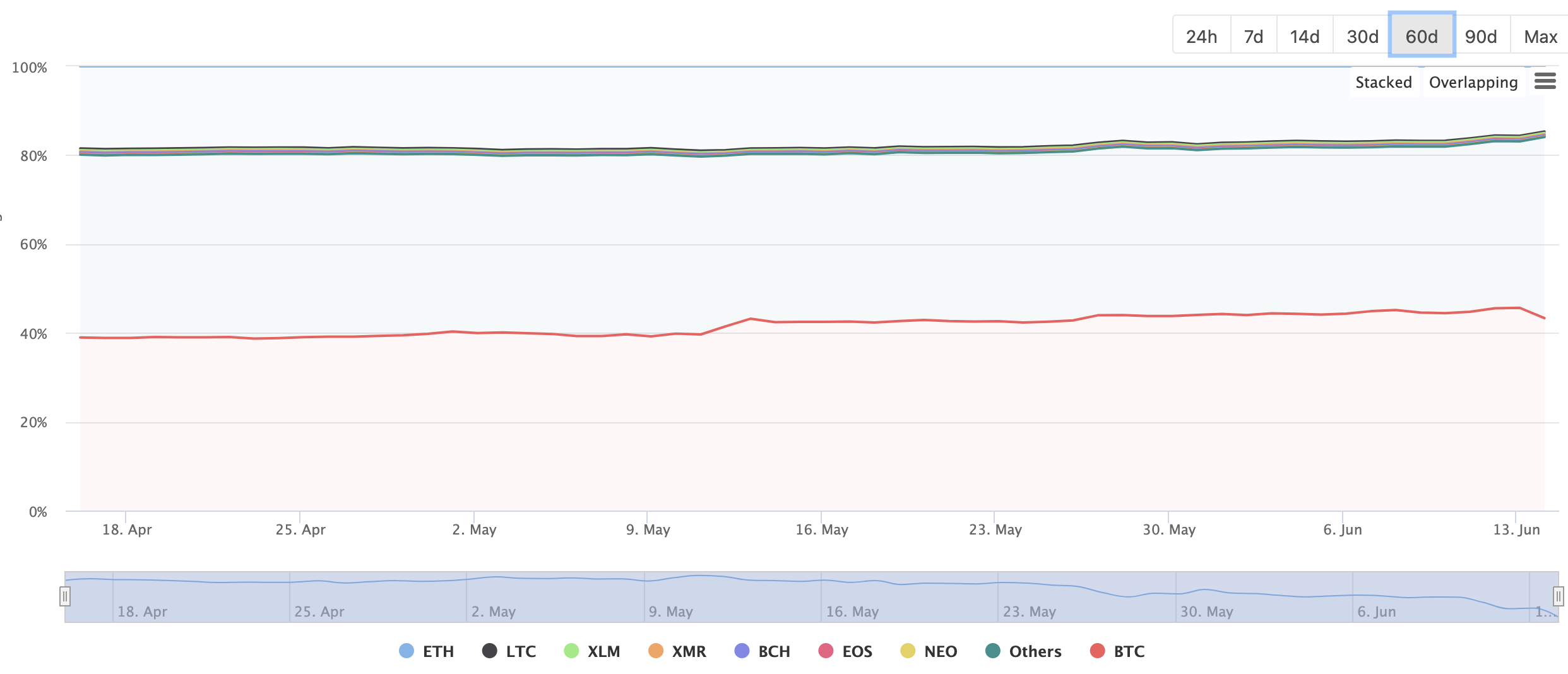 Bitcoin değer kaybetmeye devam ederken altcoin piyasasında görülen değer kazançları BTC dominance oranının azalmasına yol açıyor. Sert değer kayıplarında artmasına alıştığımız Bitcoin dominance, %43 seviyesine kadar geriledi.