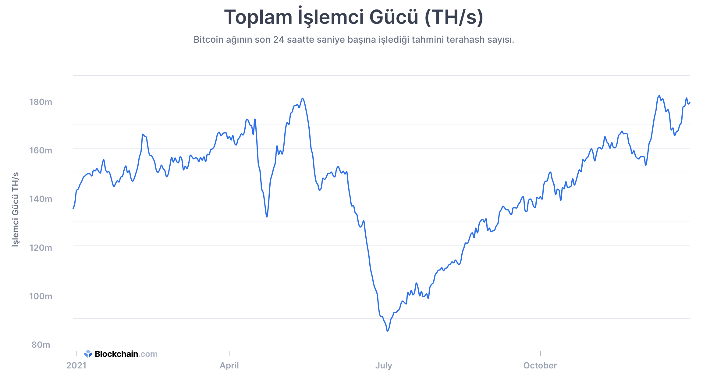 SponsoredBlockchain.com sitesinden alınan bilgilere göre, Bitcoin işlemci gücü İran’daki tesislerin yeninde açılmasının ardından hızla artmaya başlamış ve 10 Aralık tarihinde 181,7 M seviyesini görerek rekor kırmıştı. Daha öne yatırımcı ilgisinin zirve yaptığı mayıs döneminde bu seviyeleri gören işlemci gücü, Çin yasakları ve İran’ın yaz aylarında kripto para tesislerini dondurma kararı almasıyla sert bir düşüş yaşadı.