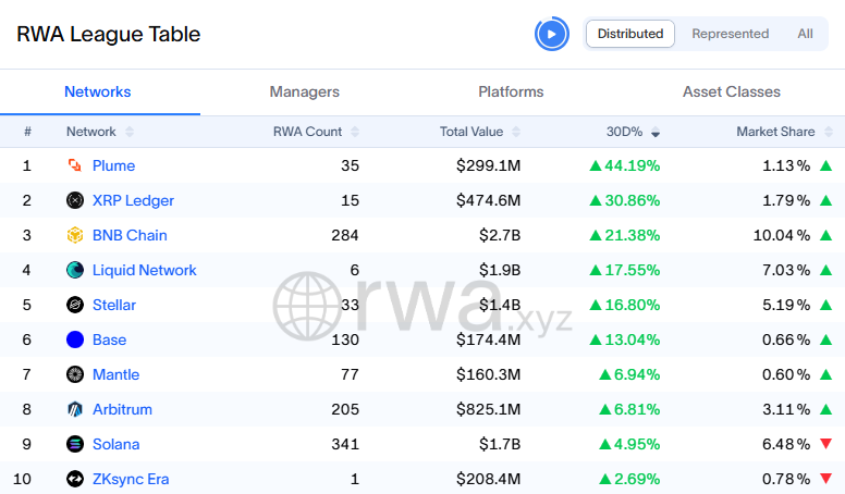 rwa.xyz verilerine göre Plume, son 30 günde RWA değer artışında birinci sırada yer alıyor ve %44,19’luk bir yükseliş kaydetti. Bu performans XRP Ledger’ın (%30,86), BNB Chain’in (%21,38) ve Stellar’ın (%16,80) üzerinde.