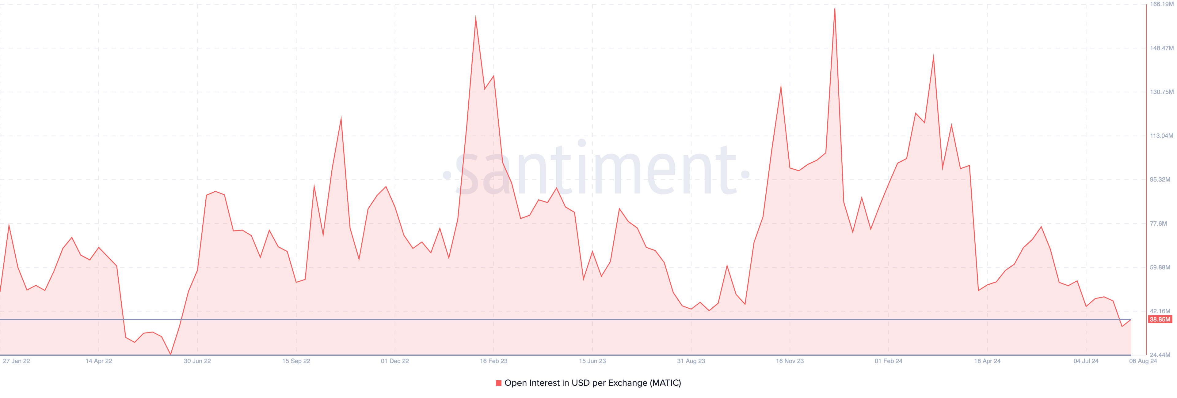Santiment’e göre, Polygon’un beklentileri kasvetli olmaya devam ediyor. Bunun bir nedeni, piyasadaki tüm ödenmemiş sözleşmelerin değeri olan Açık Faizdir (OI). Haber yayına hazırlanırken borsa başına OI 38,85 milyon dolardı.