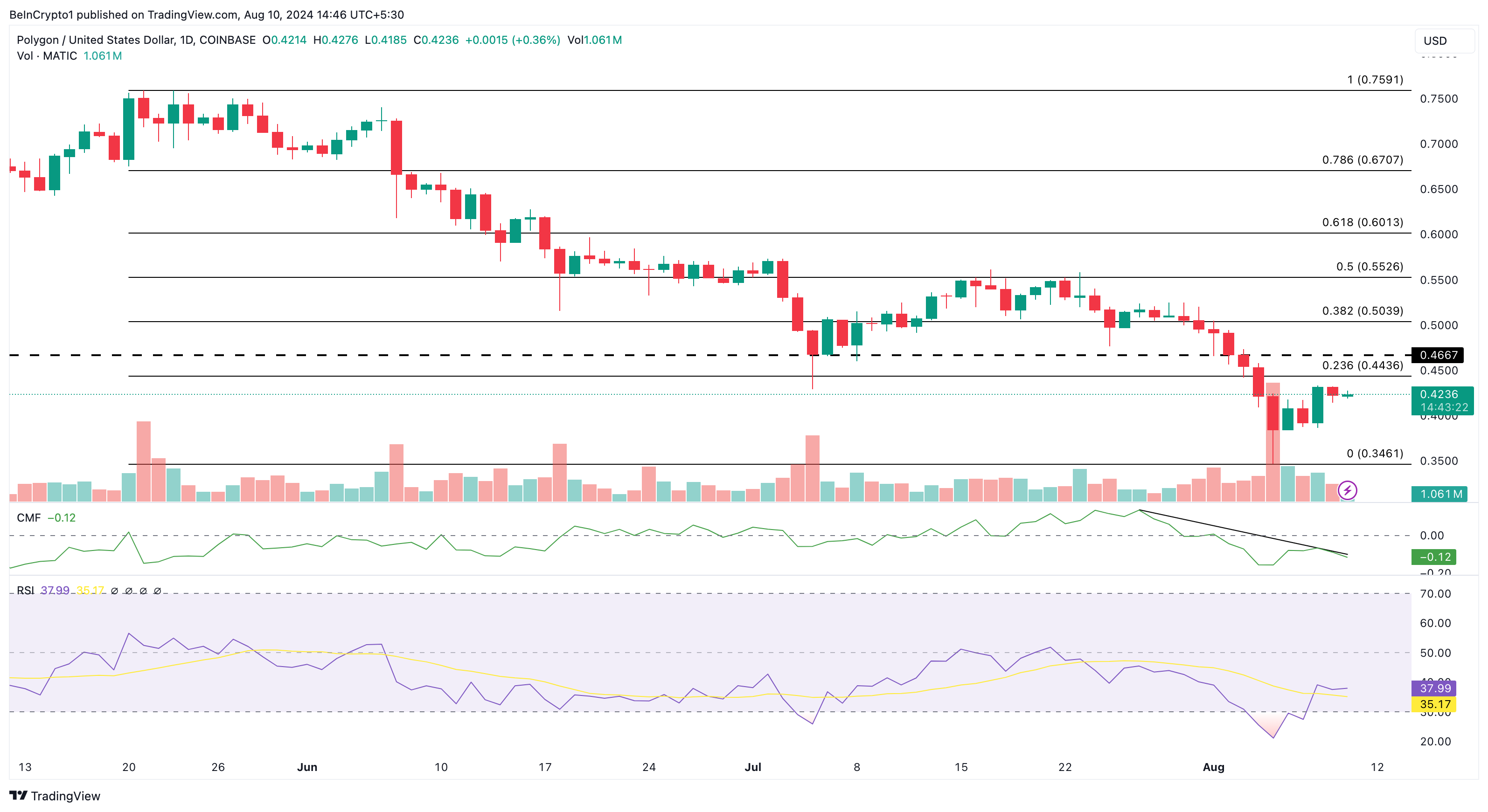 Günlük MATIC/USD grafiği, boğaların son kayıpların bir kısmını geri alabildiğini ortaya koyuyor. Bununla birlikte, token, 0,46 dolarlık kritik desteğin altında kaldığı için zorlu bir savaşla karşı karşıya. Ayrıca, birikim ve dağıtım dönemleri arasında ayrım yapmak için kullanılan Chaikin Para Akışı (CMF) -0,12’ye düşmüştür.