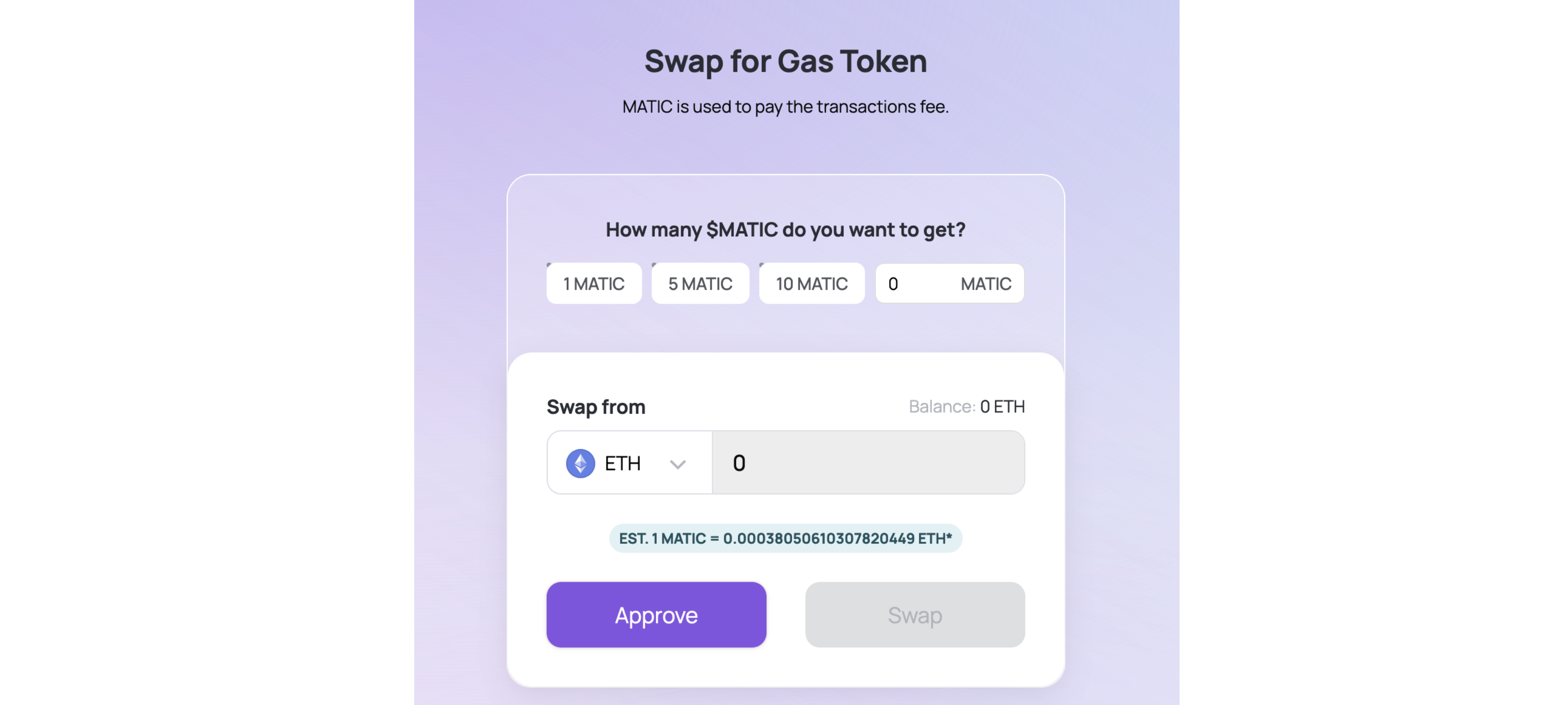 Platform geliştiricileri, ortaklık kurdukları projelerde yer alan farklı türden tokenler ile takaslamak için kullanılan MATIC’lerin sağlıklı ve ucuz bir şekilde Polygon ağına transfer edilebilmesi için yeni bir uygulama geliştirdi. Swap for gas adını taşıyan uygulama sayesinde MATIC ile Ethereum ve bu ağda bulunan tokenler neredeyse ücretsiz bir şekilde takas edilebiliyor. Uygulama bir seferde en fazla 20 MATIC takas edebiliyor. Geliştiriciler uygulamayı resmi sitede şu şekilde açıklıyor: