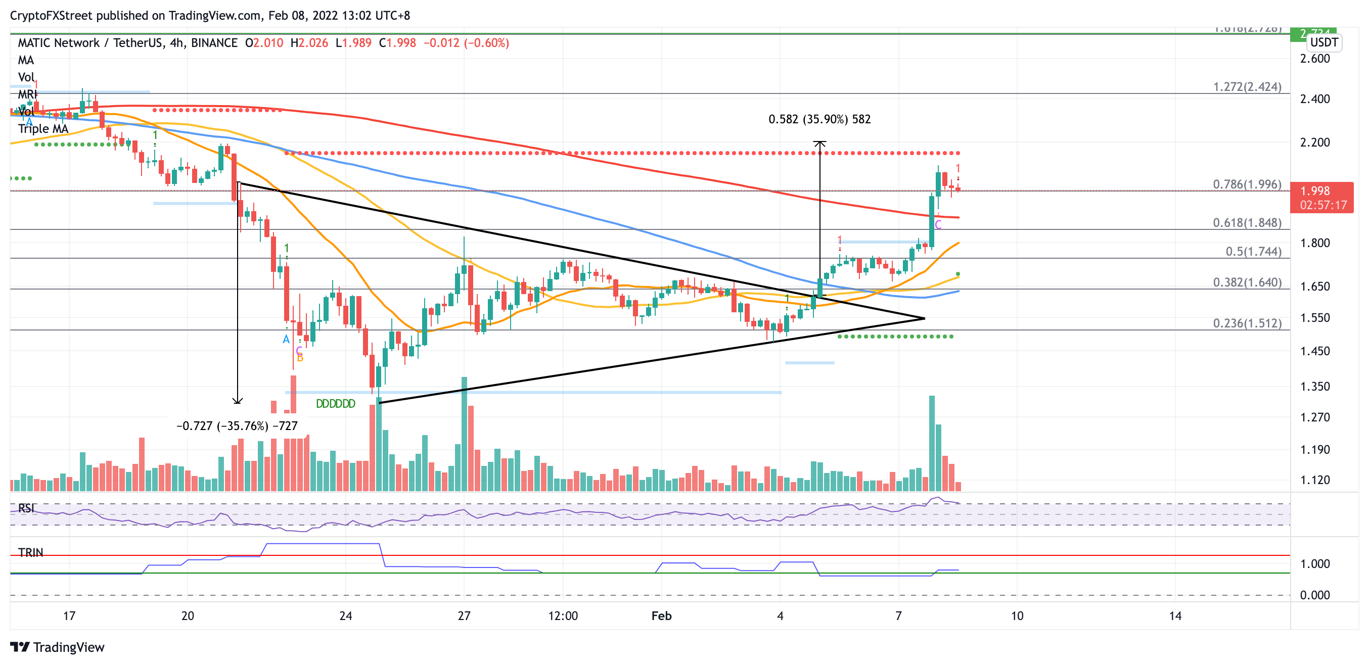 “MATIC fiyatı, 4 saatlik grafikte simetrik üçgen formasyonunun üst sınırının üzerine çıkarak 2,20 doları kırarsa %35’lik bir yükseliş gerçekleştirebilir. Polygon, iyimser hedefe neredeyse ulaştı ancak yükseliş momentumunu sürdürmek için şu an mücadele ediyor. MATIC fiyatı, 2,20 doları test etmeden önce Momentum Ters Çevirme Göstergesi (MRI) tarafından verilen 2,15 dolarda yer alan direnç çizgisi ile karşılaşabilir. TRIN, piyasada satıcılardan daha fazla alıcı olduğunu önermeye devam ediyor. Bu sebeple daha büyük beklentiler, 12 Ocak’ın en yüksek seviyesi olan ve %127,2 Fibonacci uzatma seviyesine denk gelen 2,42 doları hedefleyebilir. Ek satın alma baskısı, MATIC fiyatını %161,8 Fibonacci uzatma seviyesine denk gelen 2,72 dolara taşıyabilir”