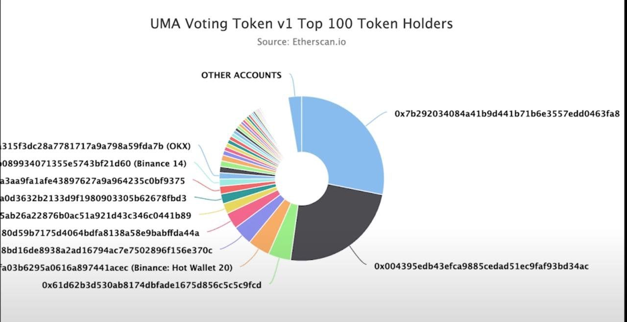 UMA çözümleme oylarının son derece yoğunlaştığını, sadece iki balinanın oy gücünün yarısından fazlasını kontrol ettiğini ekledi. Ayrıca, bir bireyin 20 milyon stake edilmiş UMA token’ının 7,5 milyonuna kadarını elinde tuttuğunu belirtti.