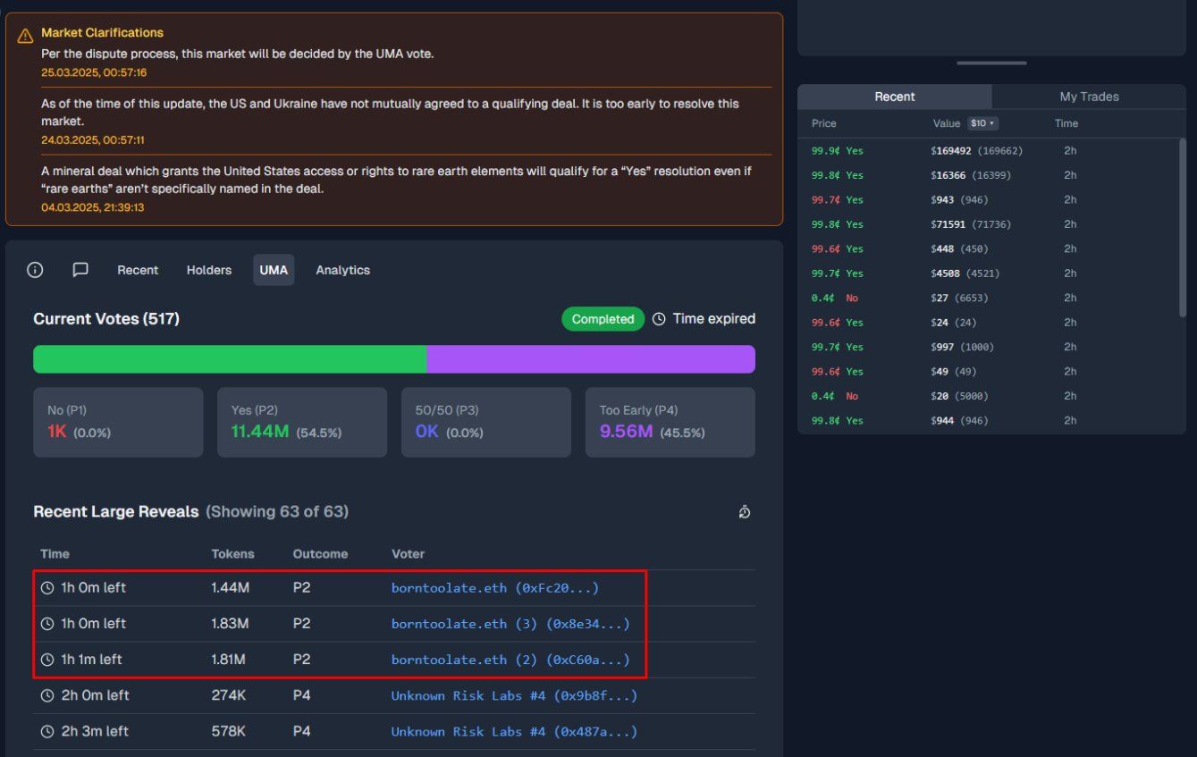 Polymarket platformundaki kurallar çözümlemenin “ABD ve Ukrayna hükümetlerinden resmi bilgilere” dayanacağını açıkça belirtti. Ancak, resmi bir onay olmamasına rağmen piyasa “Evet” olarak çözüldü ve yaygın manipülasyon suçlamalarına yol açtı.