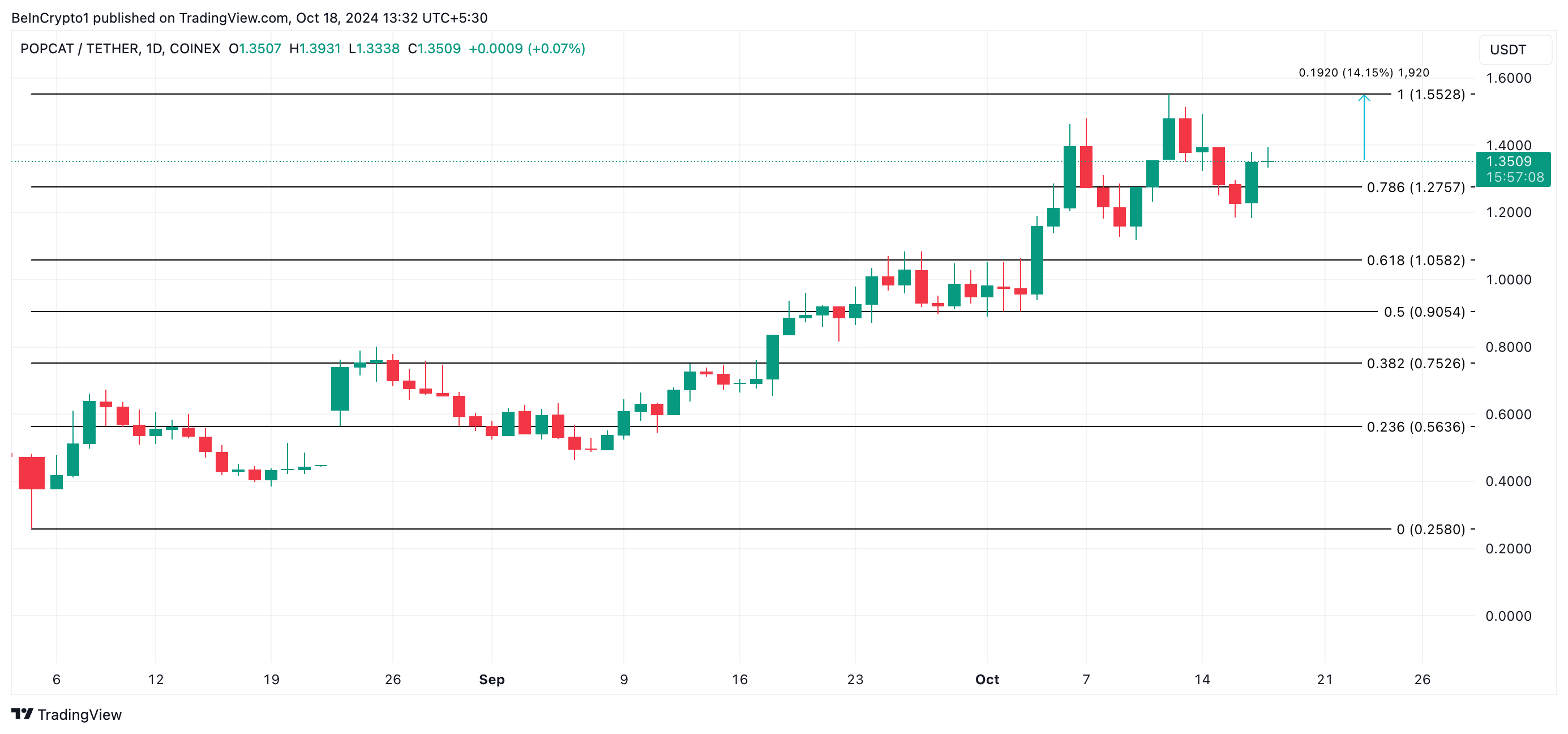 POPCAT şu anda 1,35 dolar seviyesinde işlem görüyor. 1,27 dolarlık destek seviyesinin hemen üzerinde olan fiyat, tüm zamanların en yüksek seviyesi olan 1,55 doların %14 altındadır. Mevcut piyasa ivmesi devam eder ve meme coin’e olan talep artarsa, POPCAT fiyatı yükseliş eğilimini sürdürebilir. Önceki zirvesini yeniden test edebilir ve potansiyel olarak aşabilir.