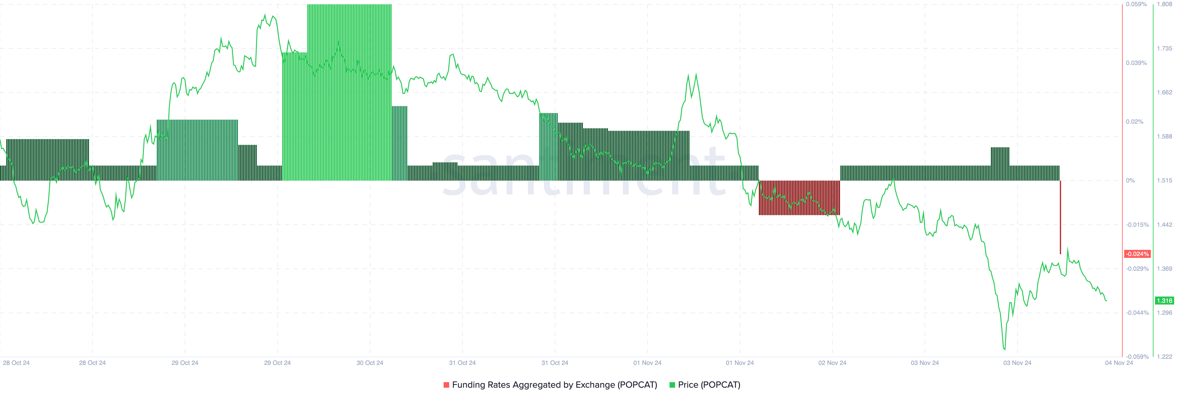 Bugün, 4 Kasım itibarıyla Santiment verileri, Popcat’in Fonlama oranının negatif bölgeye düştüğünü gösteriyor. Bağlam olarak, Fonlama oranı, türev piyasasında açık bir pozisyonun maliyetidir.
