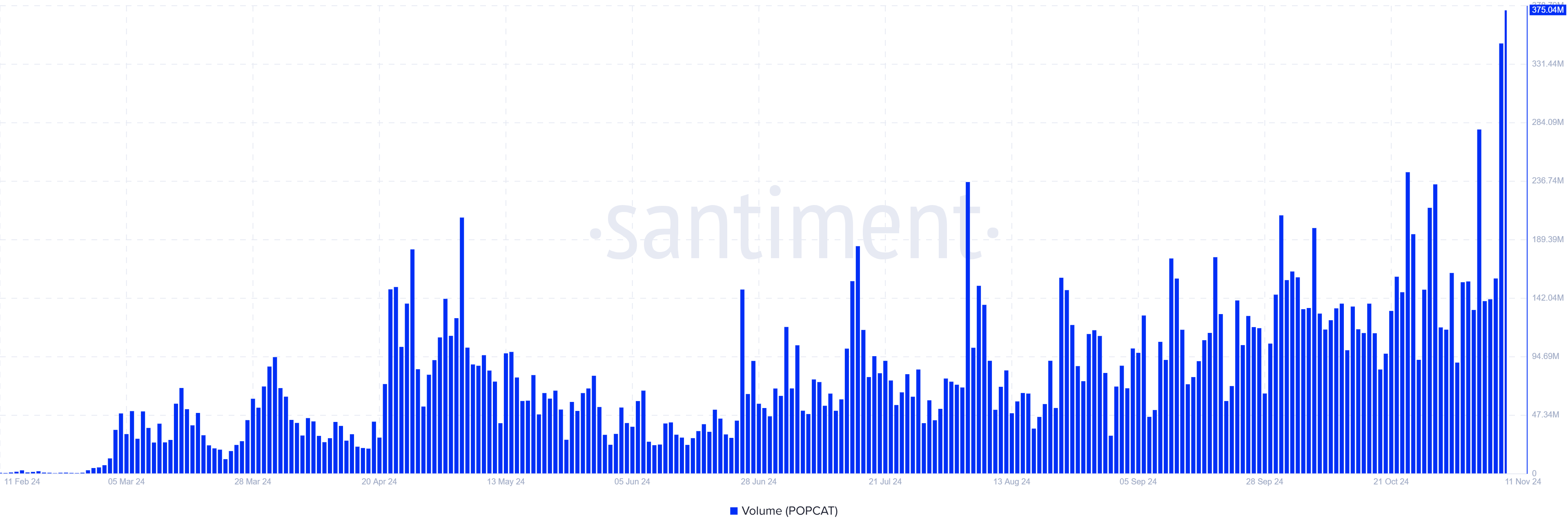 POPCAT’ın işlem hacmi rekor seviyelere yükseldi, coin’in başlangıcından bu yana en yoğun aktiviteyi işaret ediyor. Bu yüksek işlem seviyeleri, alıcıların ve satıcıların daha aktif hale gelerek coin’in potansiyeline bahse girdiği güçlü yatırımcı etkileşimini gösteriyor. Bu artan aktivite, kısa vadede büyüme potansiyeli için POPCAT’a olan yenilenen ilgiyi gösteren umut verici bir işaret.