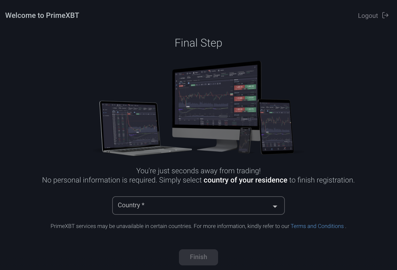 Hesaba girdikten sonra PrimeXBT bir ikamet ülkesi isteyecektir.