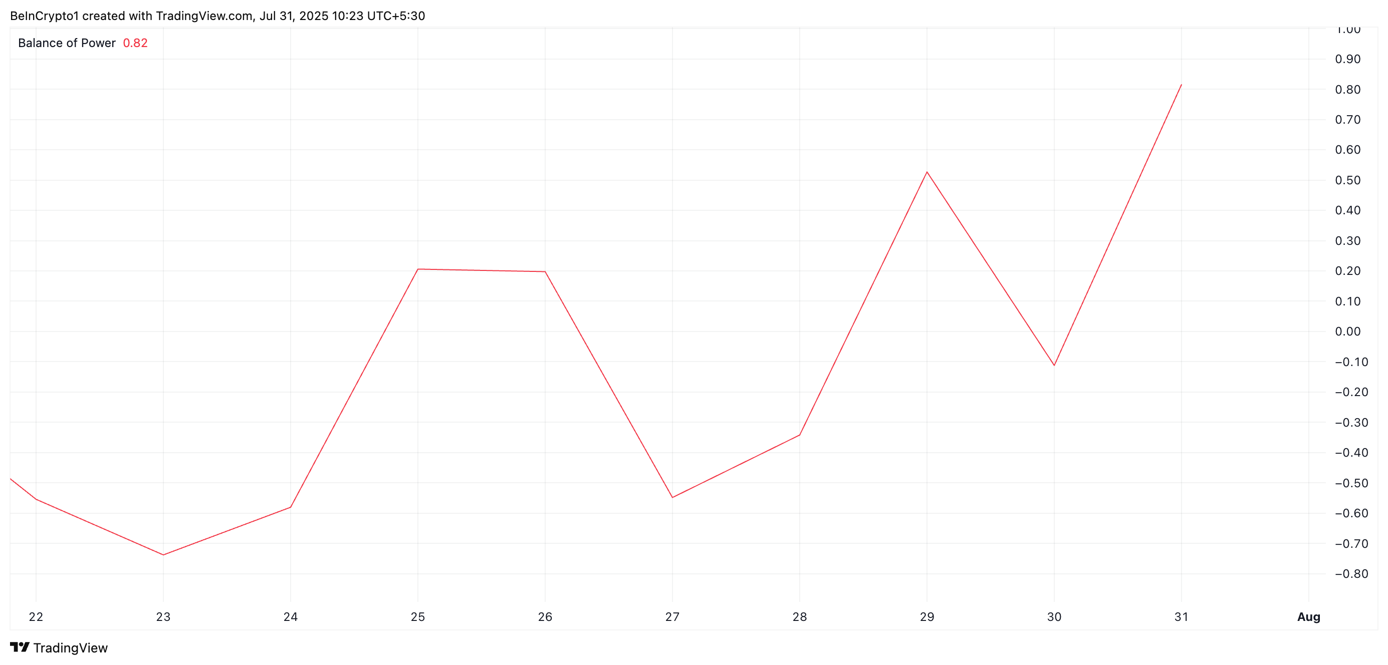 BoP göstergesi, piyasadaki alıcıların satıcılara karşı gücünü ölçer ve momentum değişimlerini belirlemeye yardımcı olur. Değeri pozitif olduğunda, alıcılar piyasada satıcılara hakimdir ve daha fazla yükselişi tetikler.