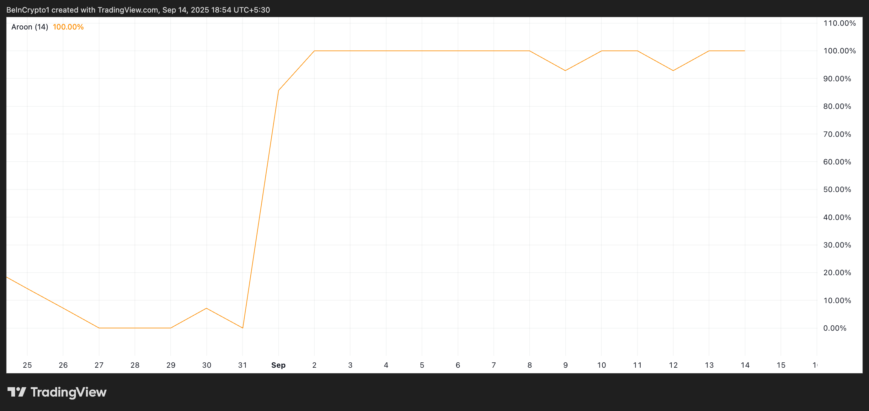 SponsoredAroon Up Çizgisi %100 seviyesinde olduğunda, yeni bir zirvenin henüz belirlendiğini ve yükseliş trendinin en güçlü okumasında olduğunu gösterir. Bu durum, PUMP alıcılarının kontrolü elinde tuttuğunu ve yukarı yönlü ivmenin yakın vadede devam edeceğini işaret ediyor.
