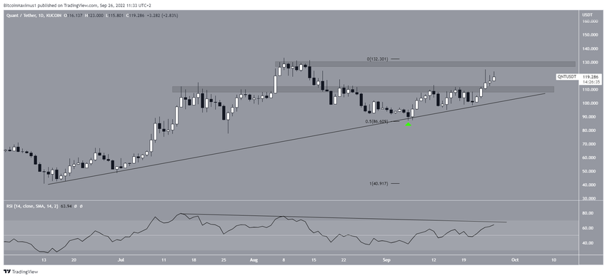 Günlük grafik de yükseliş işaretleri gösteriyor. Popüler altcoin QNT, 13 Haziran gününden bu yana yükselen destek çizgisini takip ediyor. 6 Eylül günü ise destek çizgisinden sıçrama gerçekleşti. Bu destek çizgisi o zaman ayrıca, 0.5 Fib düzeltme destek seviyesine de denk geliyordu.