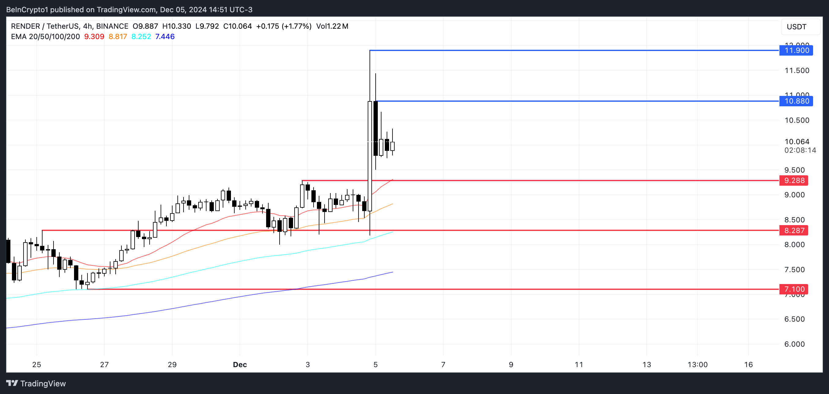 RENDER fiyatı, EMA çizgilerinde yükseliş eğilimini koruyor. Kısa vadeli ortalamalar uzun vadeli olanların üzerinde konumlanmış ve mevcut fiyat hepsinin üzerinde işlem görüyor. Bu yapı, devam eden yükseliş trendini gösteriyor ve piyasa koşulları elverişli kalırsa daha fazla yukarı yönlü momentum potansiyelini işaret ediyor.