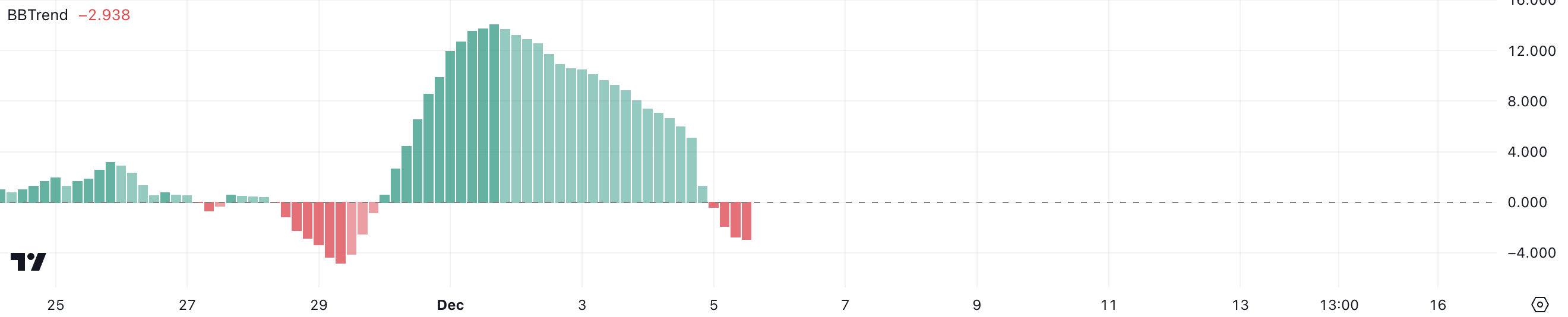 Bu odak değişikliği, RENDER BBTrend’inde belirgin bir değişimle örtüşüyor. 30 Kasım’dan 4 Aralık’a kadar pozitif kalan BBTrend, 1 Aralık’ta 14’e ulaştı. Ancak, BBTrend o zamandan beri negatif hale geldi ve şu anda -2,9 seviyesinde, bu da momentumda keskin bir tersine dönüşü işaret ediyor.