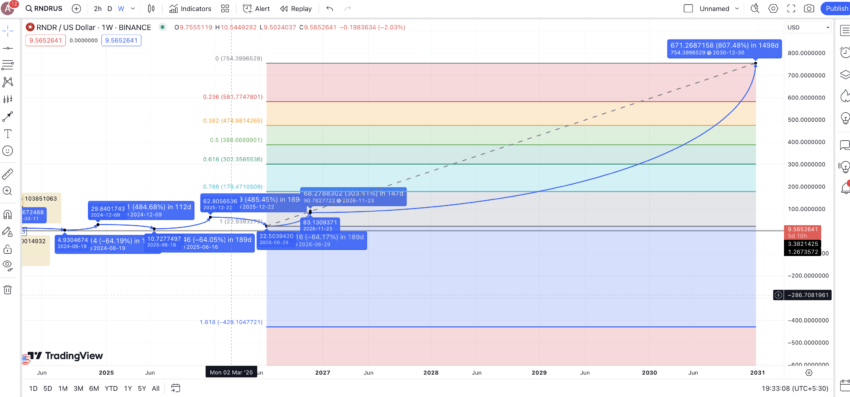 Şimdi, bu bulguları 2026’nın en düşük ve 2026’nın en yüksek değerlerini kullanarak tahmin ederseniz RNDR’in 2030’a kadar gelecekteki fiyatının grafiğini çizebiliriz. Bu, 2030’un en yüksek seviyesini 754,40 dolara koyuyor.