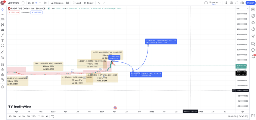 Beklenen düşük seviye olan 4,93 dolardan fiyat artışı ile RNDR’in fiyatı 2024 sonuna kadar 28,80 dolara çıkabilir.