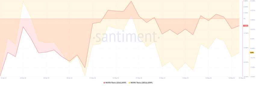 XRP’nin 30 günlük ve 365 günlük hareketli ortalamalar kullanılarak gözlemlenen Piyasa Değeri/Gerçekleşen Değer (MVRV) oranı, sırasıyla -%1,3 ve -%9,8 negatif değerler kaydetti. Bu, dipten satın almak ve mevcut piyasa hareketlerine karşı işlem yapmak isteyenler için iyi bir satın alma fırsatı olabilir .