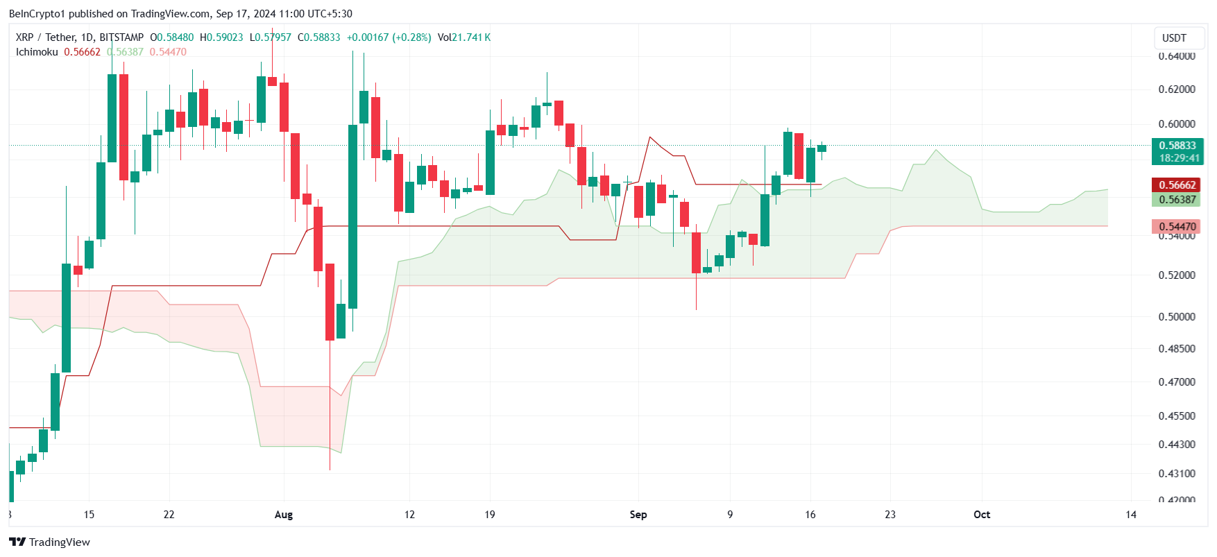Ichimoku Bulut göstergesi şu anda XRP için boğa eğilimi sergiliyor. Mum çubuklarının altında konumlanan gösterge, altcoin’in yükselme potansiyeline sahip olduğunu veya önemli düzeltmelerden kaçınabileceğini öneriyor. Bu gösterge, XRP’ye 0,60 dolar seviyesini yeniden kazanmaya çalışması için kısa vadeli bir iyimserlik sunuyor.
