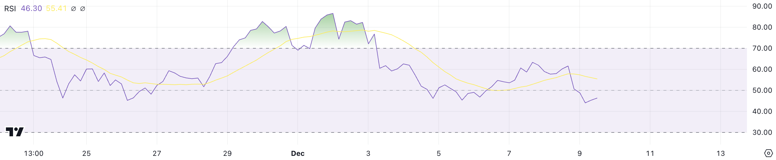 Ripple (XRP) fiyatı son 30 günde %330’dan fazla arttı. Solana’nın piyasa değerini geride bırakarak 6 yılın en yüksek seviyelerine ulaştı. Ancak, RSI göstergesi şu anda 46 değerini gösteriyor. 29 Kasım ile 3 Aralık arasında görülen ve XRP’nin 2018’den bu yana en yüksek seviyesi olan 2,90 dolardaki aşırı alım seviyesine kıyasla önemli bir düşüş yansıtıyor.