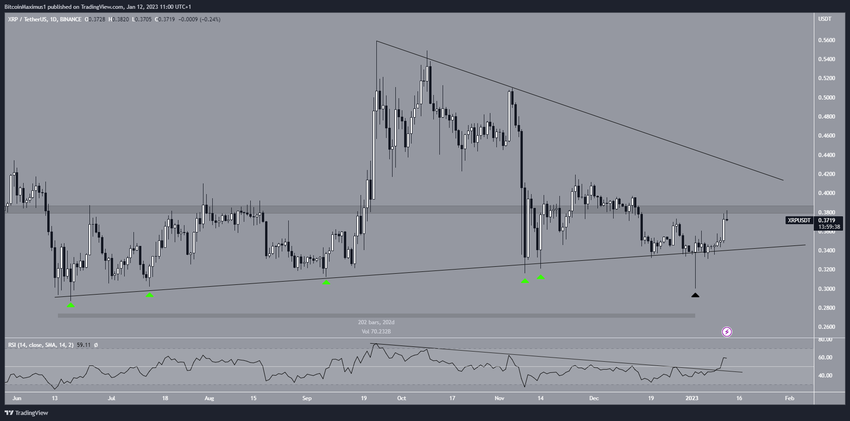 Ancak aşağı sarkan uzun fitil oluşturdu ve aynı gün boğa çekiç mumu yarattı (siyah simge). Bu, XRP’yi kırılımdan kurtardı ve yükselişi başlattı. Son 24 saatte ise artış hız kazandı. Şu anda XRP, 0,384 dolar direncinin hemen altında işlem görüyor.