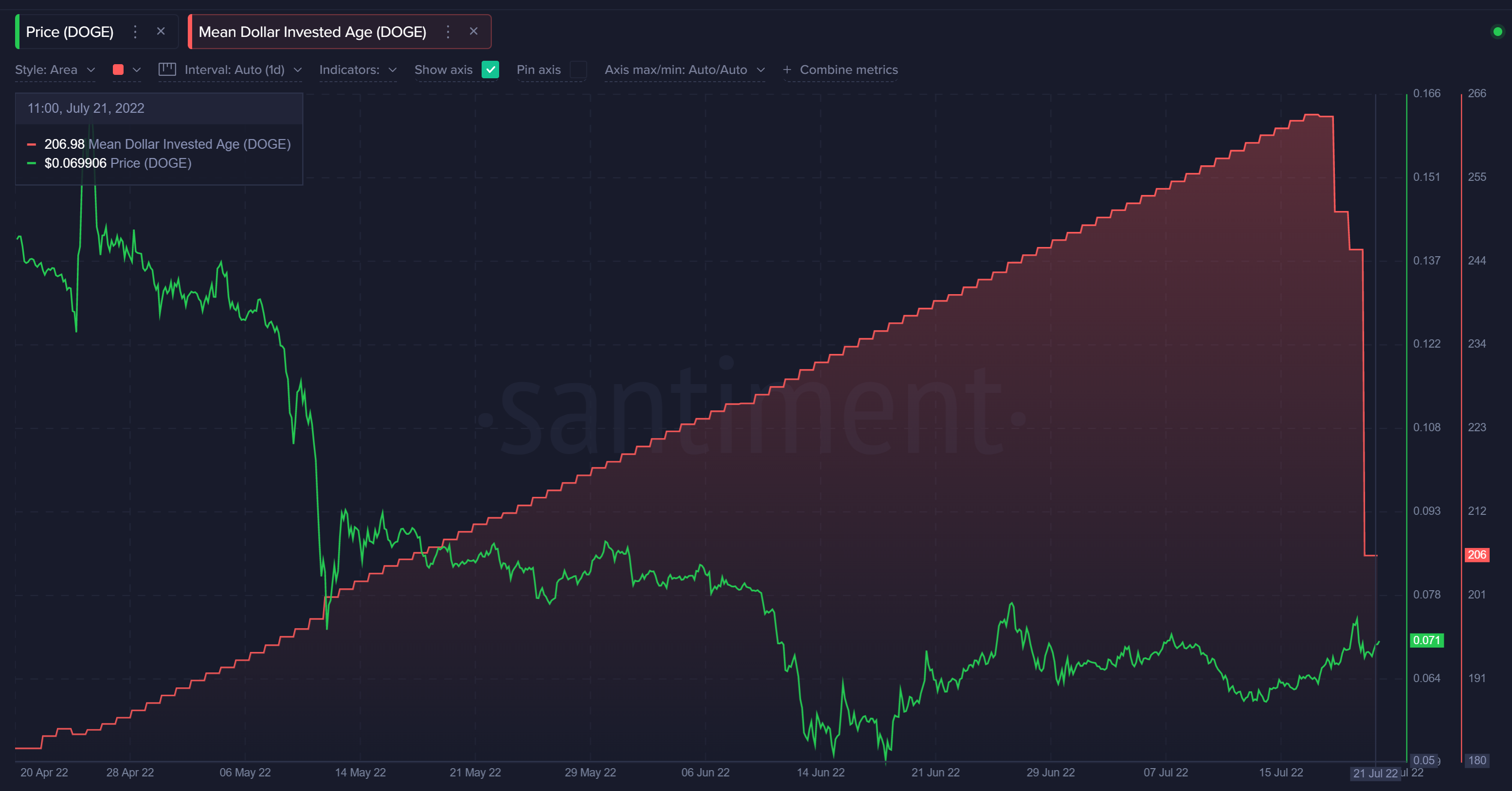 “18-21 Temmuz arasında DOGE’ye yapılan ortalama yatırımlar 264 günden sadece 207’ye geriledi ve düşüş henüz yaşanmamış olabilir! Dogecoin, göz açıp kapayıncaya kadar Mayıs seviyelerine kadar giden MDIA’si ile dikkatli olunması gereken bir varlık olarak öne çıkıyor.”
