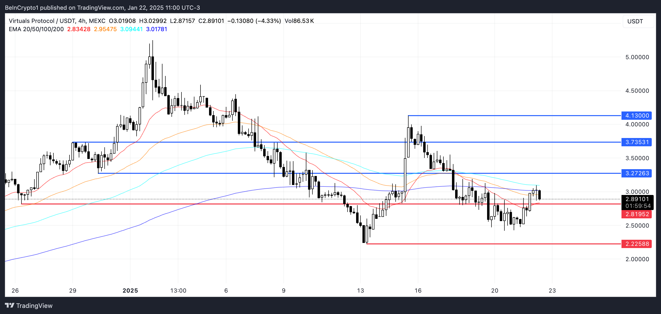 Öte yandan, mevcut ivme kaybolursa, VIRTUAL 2,81 Dolar destek seviyesini test etmek için geri çekilebilir. Bu seviyenin altına düşmek, 2,22 Dolar’ı potansiyel bir alt hedef olarak belirleyerek, VIRTUAL’ın önde gelen kripto AI ajanı coin olarak konumunu tehdit edebilir.