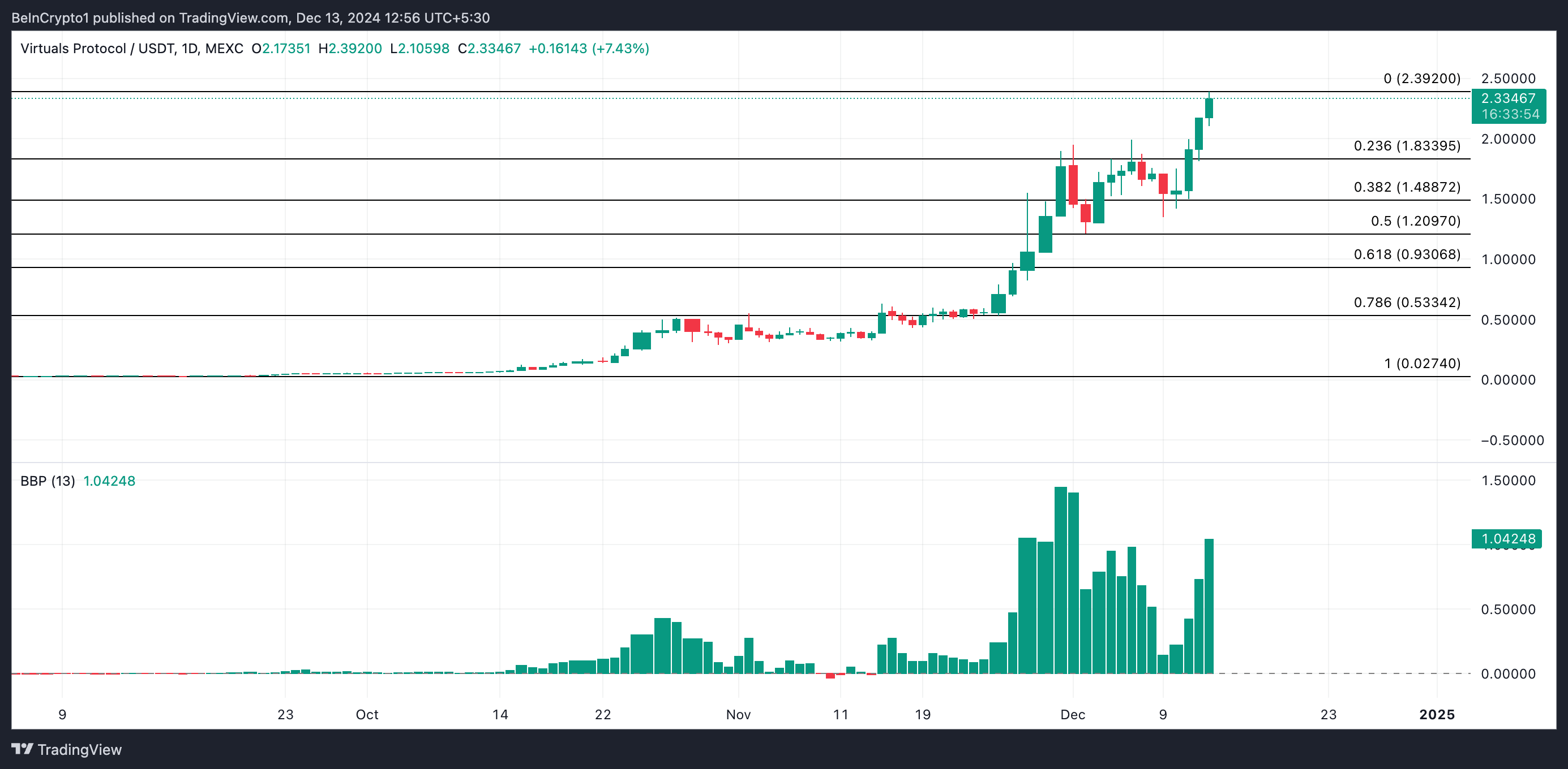 Günlük grafikte, VIRTUAL’ın Elder-Ray Endeksi bu yükseliş görünümünü destekliyor. Basın zamanı itibarıyla, gösterge sıfır çizgisinin oldukça üzerinde, 1,04 seviyesinde.