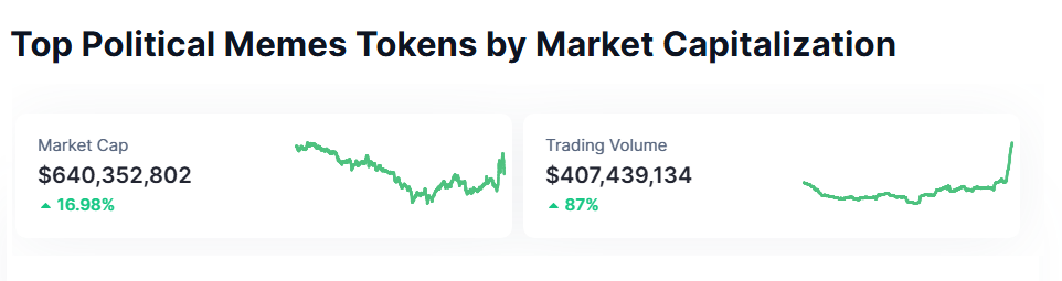 CoinMarketCap verilerine göre, politik meme coin’lerin piyasa değeri 640 milyon doları aşarak bir günde yaklaşık %17 arttı. Ayrıca, bu meme coin’lerin 24 saatlik işlem hacmi 400 milyon doları geçerek %87 artış gösterdi.