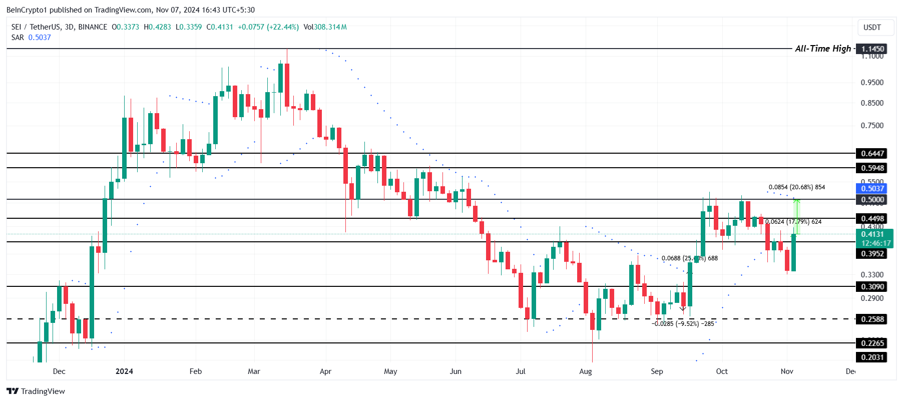 Van de Poppe, SEI 0,50 doları aşmayı başarırsa, Mart ayında ulaşılan 1,14 dolarlık tüm zamanların en yüksek seviyesine (ATH) doğru bir ralli yapabileceğini öne sürüyor. Böyle bir hamle, sürekli bir boğa hissiyatı ve yüksek işlem hacmi gerektirecektir.