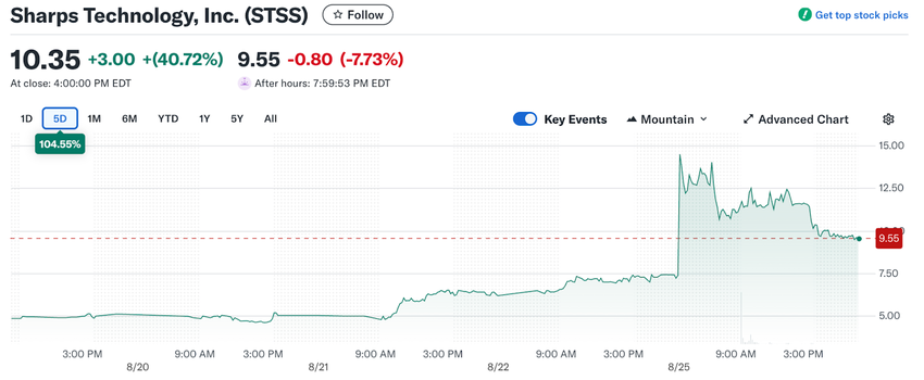 Tıbbi cihaz şirketi Sharps Technology, Pazartesi günü Solana tabanlı dijital varlık hazinesi kurma planını duyurmasının ardından değerini neredeyse ikiye katladı. Hisseleri %96 artarak gün içi en yüksek seviye olan 14,53 Dolara ulaştı.