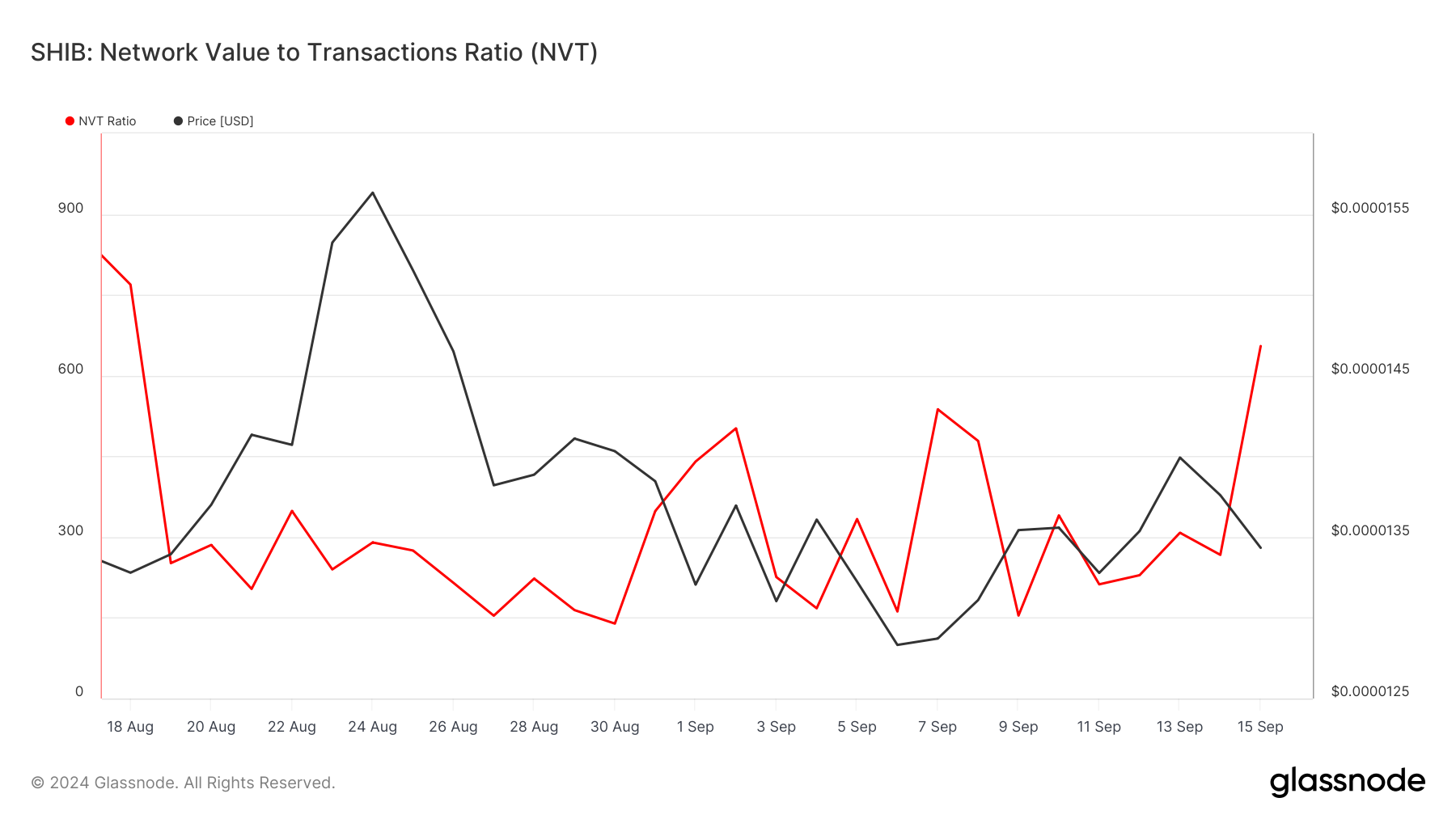 Shiba Inu (SHIB) şu anda 0,000013 dolar seviyesinden işlem görüyor. Hala tüm zamanların en yüksek seviyesinden %85 düşük. Glassnode’a göre, SHIB’in Ağ Değeri ile İşlemler (NVT) oranı 14 EYLÜL’de sıçradı. Şu anda yüksek seviyede kalmaya devam ediyor.