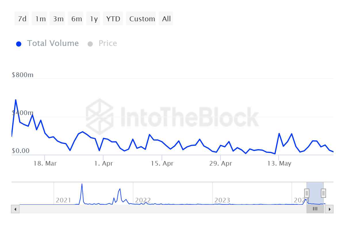 100.000 doları aşan toplam işlem hacmi genellikle balinalarla ilişkilendirilir. SHIB için bu hacim düşüşe geçti ve balinaların günlük işlem hacmi 30 milyon dolara kadar düştü.