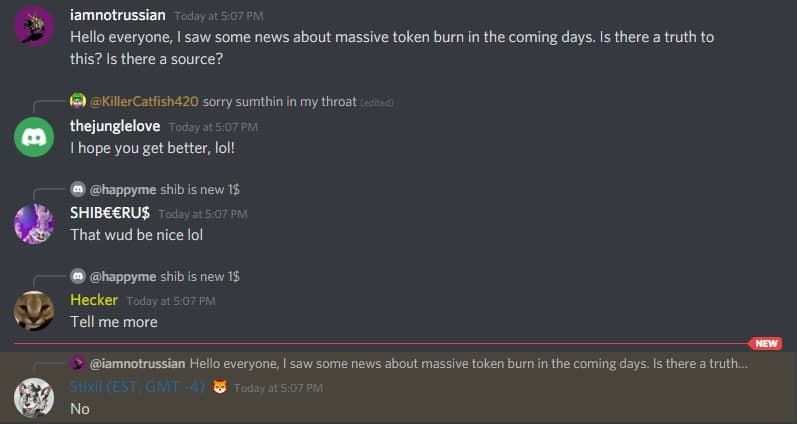 Popüler altcoin Shiba Inu, 2021 yılının başlarında yakaladığı yükselişle gündeme oturmuş, ve son çeyrekte fiyat rekorlarını geliştirerek en çok konuşulan altcoinler arasına ismini yazdırmıştı. Son günlerde SHIB için yeni bir burn programı başlatılacağı ve bunun, ağın tarihindeki en büyük burn programı olacağı iddiaları bulunuyordu. BeInCrypto olarak projenin discord kanalında bu iddiaları sorduğumuzda, bunların doğru olmadığını ve burn programının gerçekleşmeyeceği yanıtını aldık.