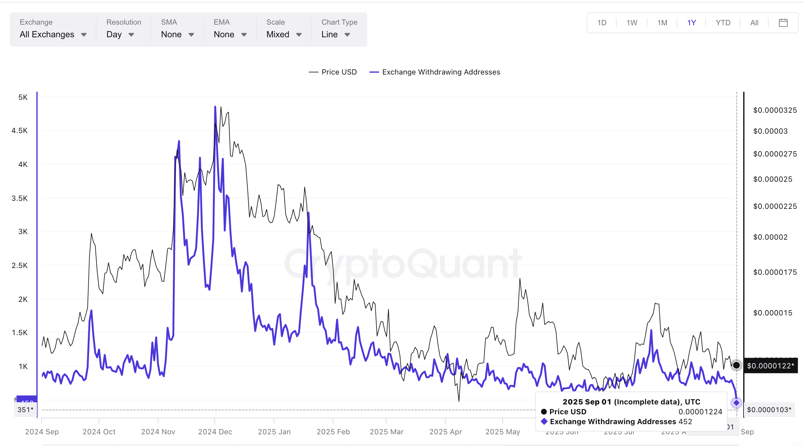 Genellikle, kripto para borsalarından artan çekilmeler, yatırımcıların token’ları uzun vadeli depolamaya taşıdığını gösterir. Ancak, ham çıkışları incelemek yerine, Exchange Withdrawing Addresses metriği, çekim yapan benzersiz adreslerin sayısını sayar — bu da geniş katılımın daha doğru bir göstergesidir.