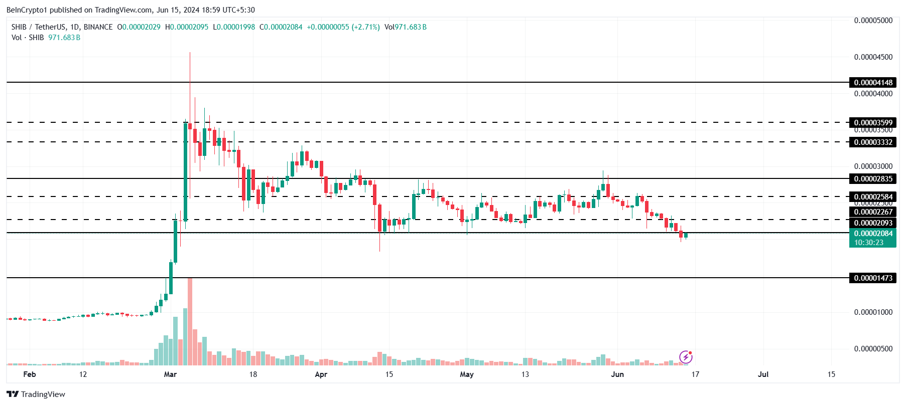 Shiba Inu, yaklaşık iki aydır 0,00002835-0,00002093 dolar arasında konsolide olmuş durumdaydı. Yatırımcılar bu bölgeden bir çıkış beklerken SHIB bu bölgenin altına düştü. Bu altcoin, şu anda 0,00002084 dolardan işlem görüyor.