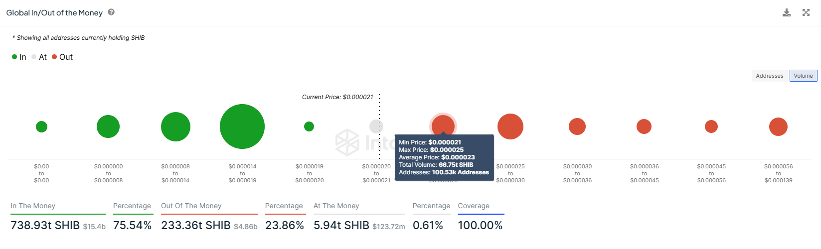 SponsoredKüresel Para Girişi/Çıkışı (GIOM) göstergesinde görüldüğü gibi, 0,00002100-0,00002500 dolar arasında yaklaşık 66,75 trilyon SHIB satın alındı. 1,38 milyar dolar değerindeki bu arz, SHIB konsolide kalsaydı karlı hale gelecekti. Bu olasılık, meme coin konsolidasyon bölgesinin altına düştüğünde ve 0,00002084 dolardan işlem görmeye başladığında darbe almış oldu.